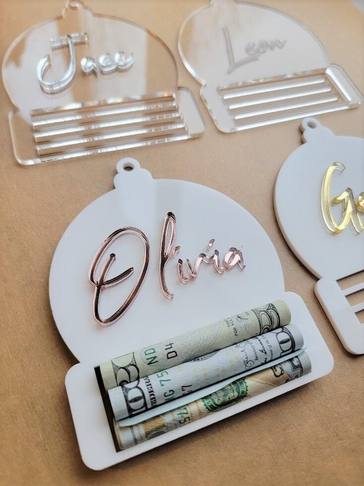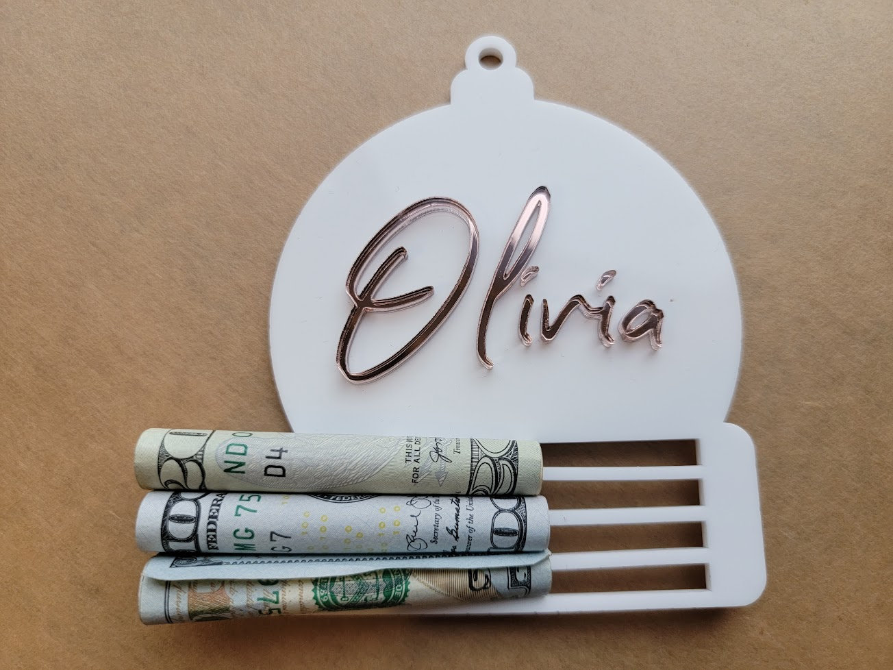 Perfect personalized ornament for the Holiday tree. Everyone loves money!