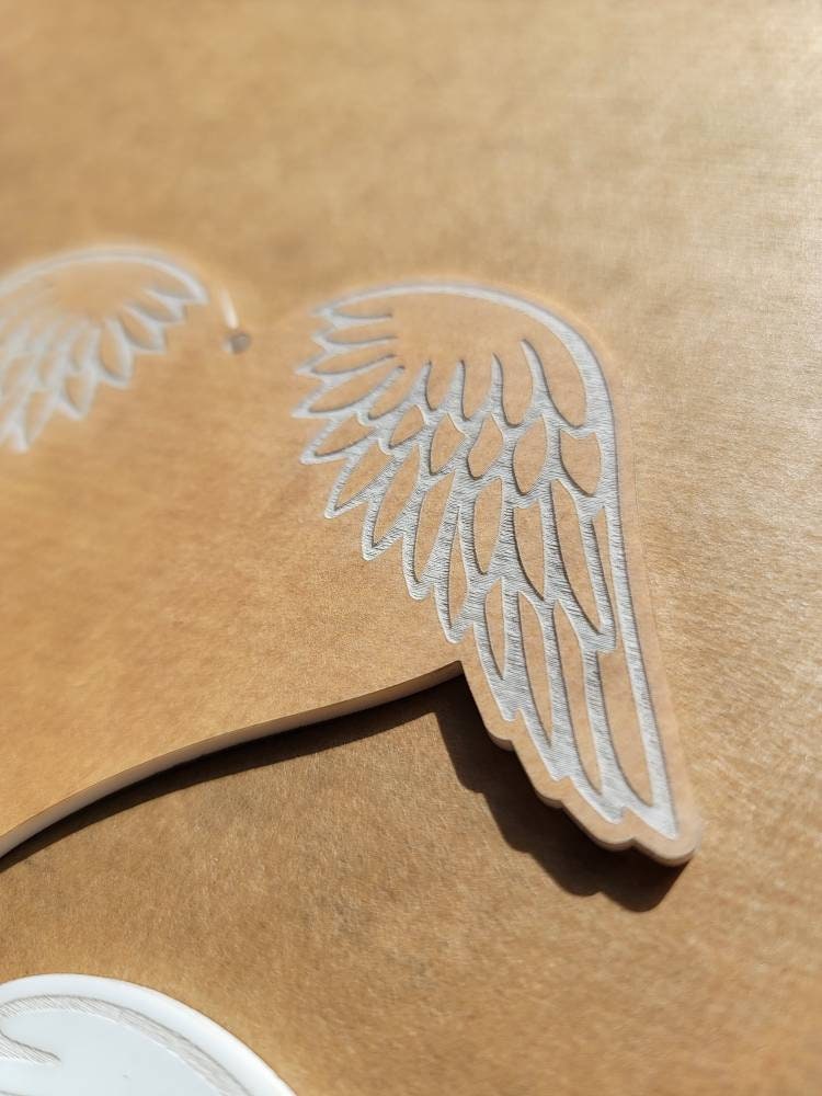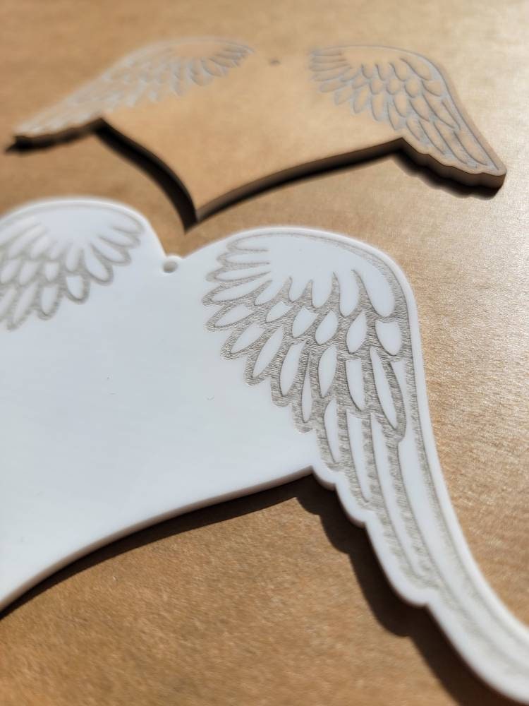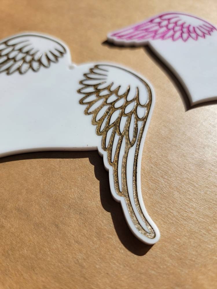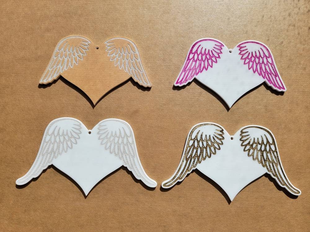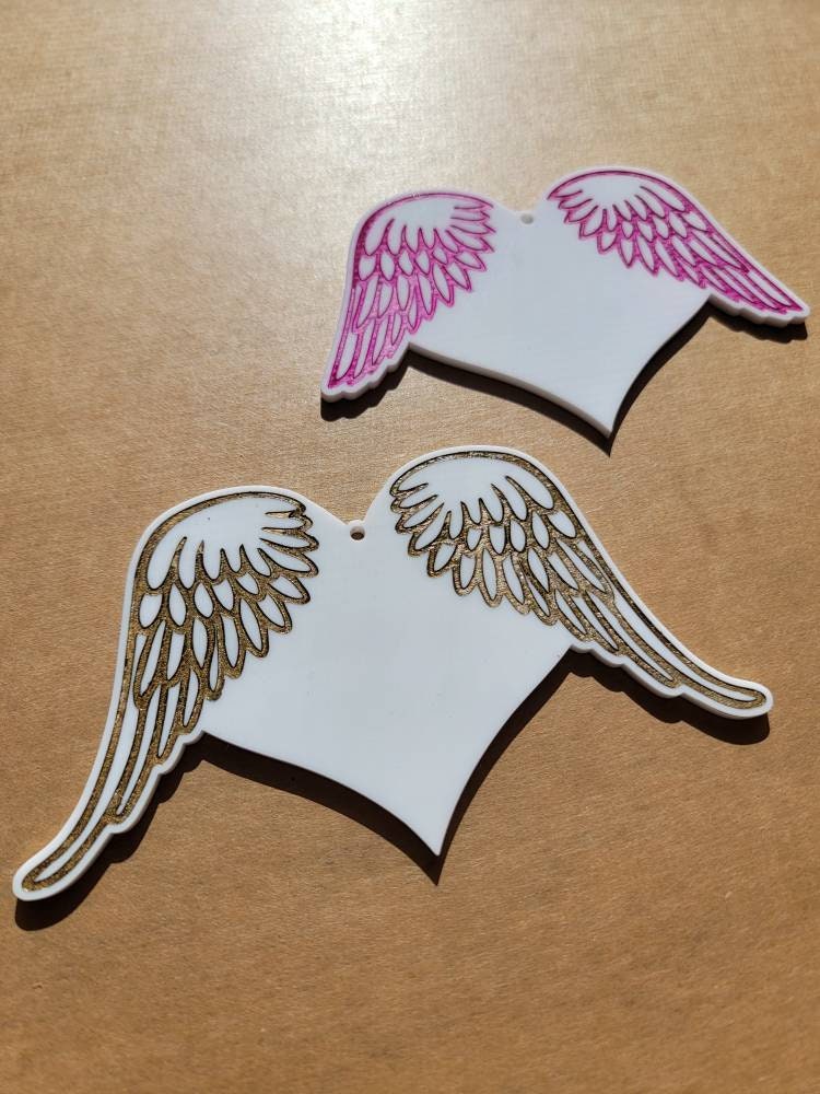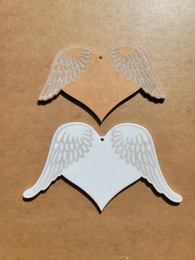 Wholesale Heart Blanks. Great for any crafter or small business. The wings are engraved into the acrylic and masking is left on, this allows for easy painting of the wings before removing the masking.