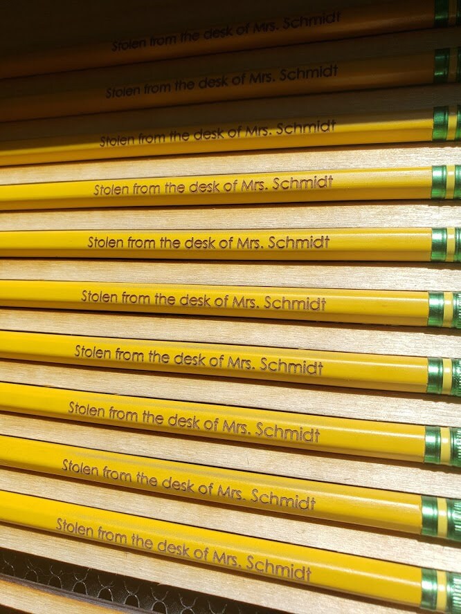 Personalize your own Pencil! We can engrave any saying you want (As long as it fits on the pencil). Perfect for keeping school supplies with the correct kid. Also great for a present to a teacher!